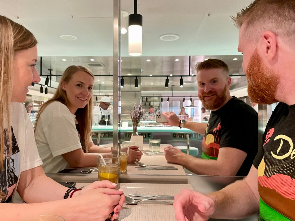 Janet and I ate dinner that night on board at the “Test Kitchen”. Now this was a controversial decision because the rest of our crew (the ones that really liked booze 🍹 and beaches ☀️) thought it was too fancy-schmancy. Janet and I weren’t passing up the opportunity to try a 1 Michelin ⭐️ unique dining experience – we broke off and went just the two of us. Everyone else went and had to cook their own shrimps and squid or something…