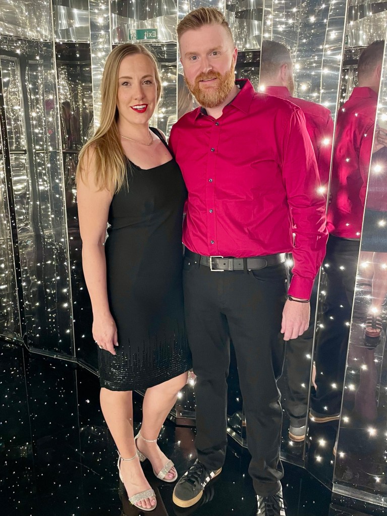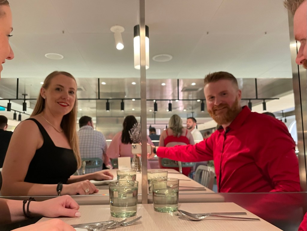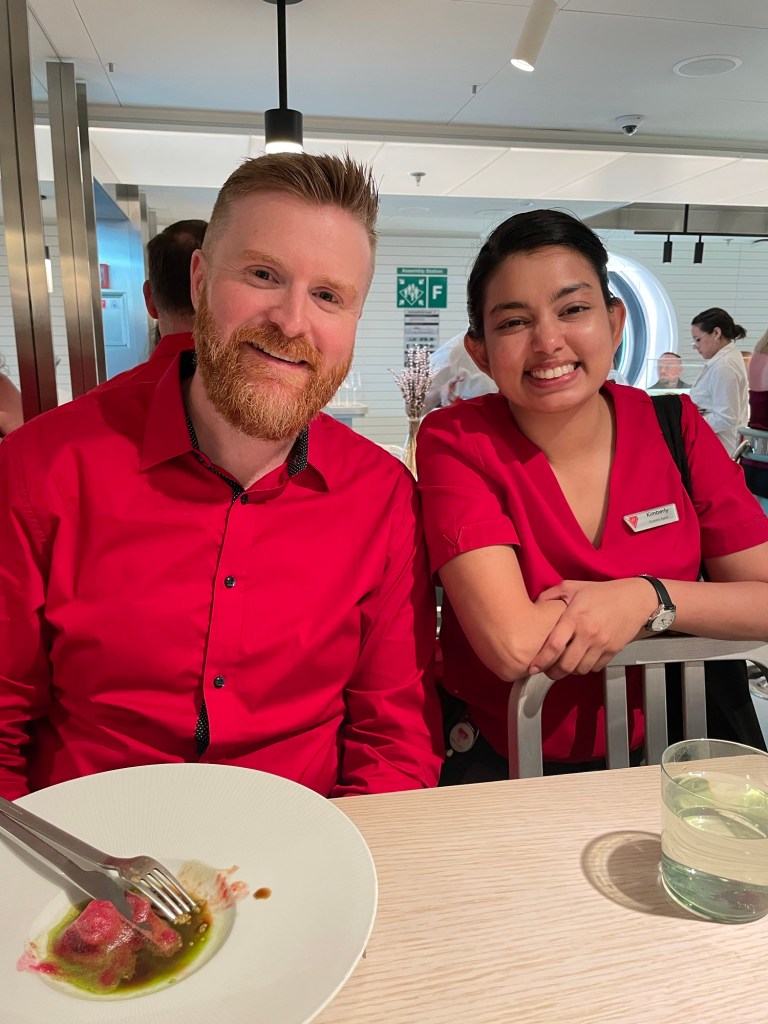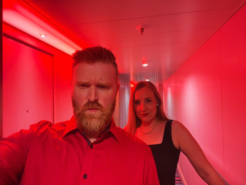 During a Virgin Voyage, โScarlet Nightโ, everyone wears red. I didnโt know what to expect, this is a unique form of โformal nightโ. Janet was excited to wear the black dress she was engaged in, which is black (not red), so she slapped on the ruby lipstick ๐ I put on the $27.36 dress shirt I ordered on Amazon a couple weeks before. We. Looked. sexy.